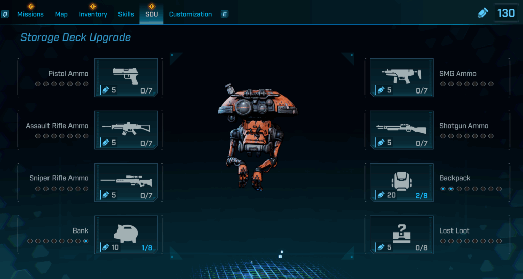 Storage Deck Upgrades, or SDU for short, is what you need for permanent backpack expansion. These work similar to the previous Borderlands games but the costs have changed quite a bit. The first backpack upgrade costs only 5 SDU which is pretty reasonable, but it gets expensive real quick.