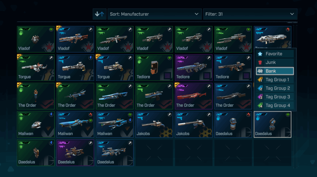 Someone in the Steam forums mentioned that they use the bank to store weapons for their other characters too, which is pretty smart. You can also store gear with Firmware mods there since those are usually worth keeping.